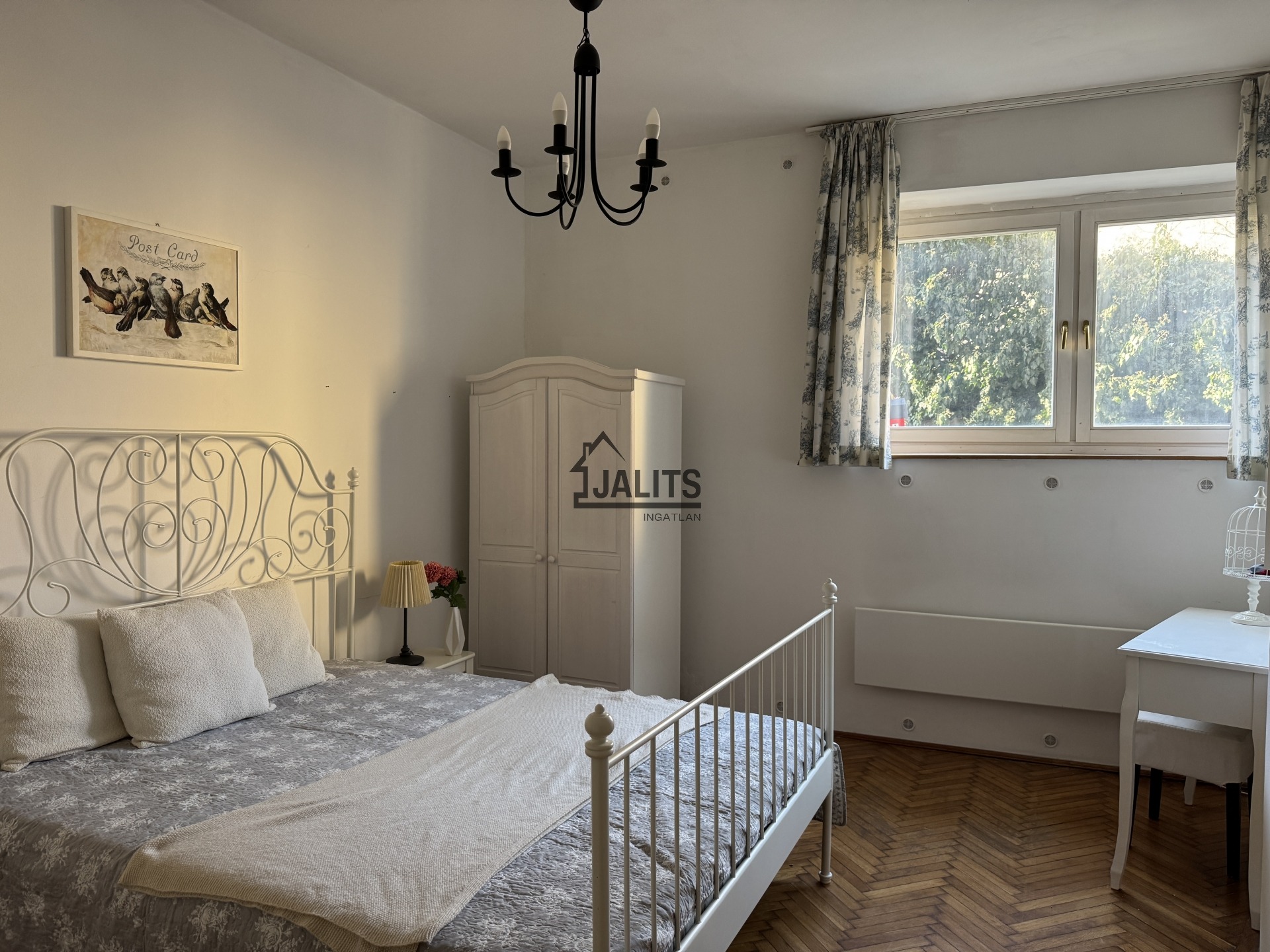 - a szoba hangulatát egy romantikus, fehér kovácsoltvas franciaágy határozza meg, a szekrény mellett helyet kaphat egy kisebb íróasztal vagy egy kanapés olvasósarok
